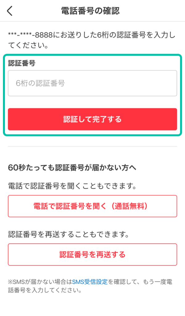 5. 確認コードが正しく入力されれば、電話番号の確認が完了します。