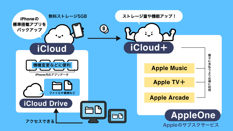 iCloudは、Appleが提供するクラウドストレージサービスです。写真、ビデオ、ドキュメント、連絡先など、さまざまなデータを保存し、複数のデバイス間で同期することができます。