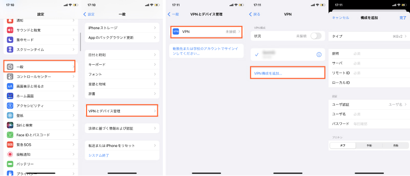 - VPN設定を確認し、正しい情報が入力されていることを確認します。