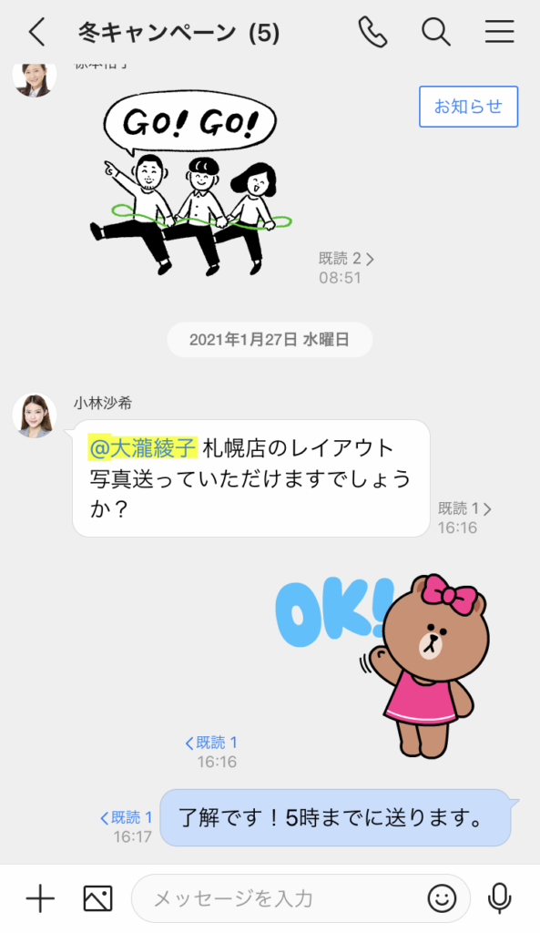 一部のアプリでは、特定のユーザーにメンションすることができます。メンションされたユーザーは、そのメッセージを既読する必要があります。したがって、メンションされたユーザーが既読者となります。