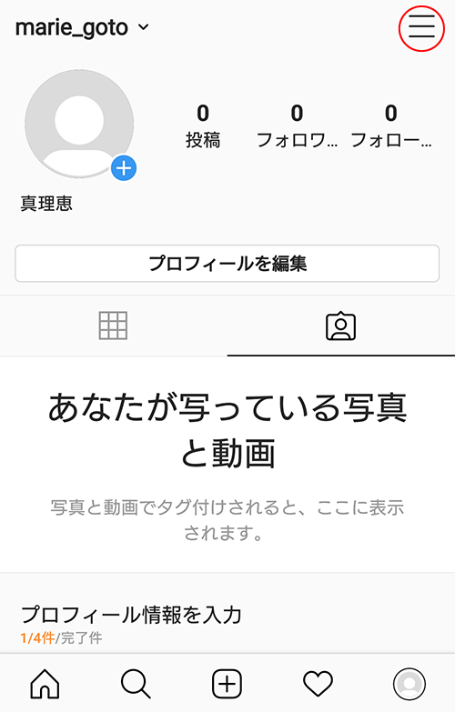 3. プロフィールページが表示されたら、右上のメニューアイコンをタップします。