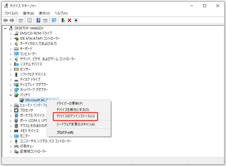 - バッテリーを展開し、「Microsoft ACPI-準拠の制御メソッドバッテリー」を右クリックします。